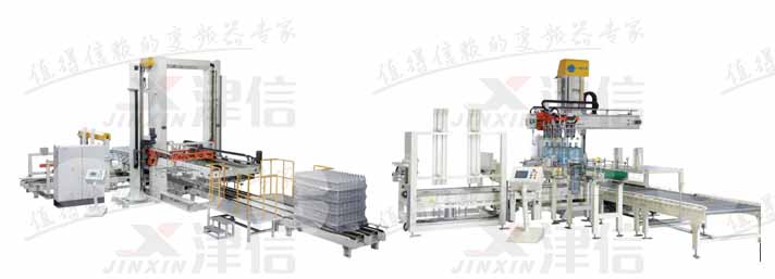 本項目設備名稱為碼垛機和卸垛機,碼垛機是將已裝入容器的紙箱,按一定排列碼放在托盤、棧板(木質、塑膠)上,進行自動堆碼,可堆碼多層,然后推出,卸垛機的工作原理基本和碼垛機一樣,只不過工序不一樣;丹佛斯變頻器在本項目中主要負責所有電機的控制,包括輸送線控制、定位控制等。